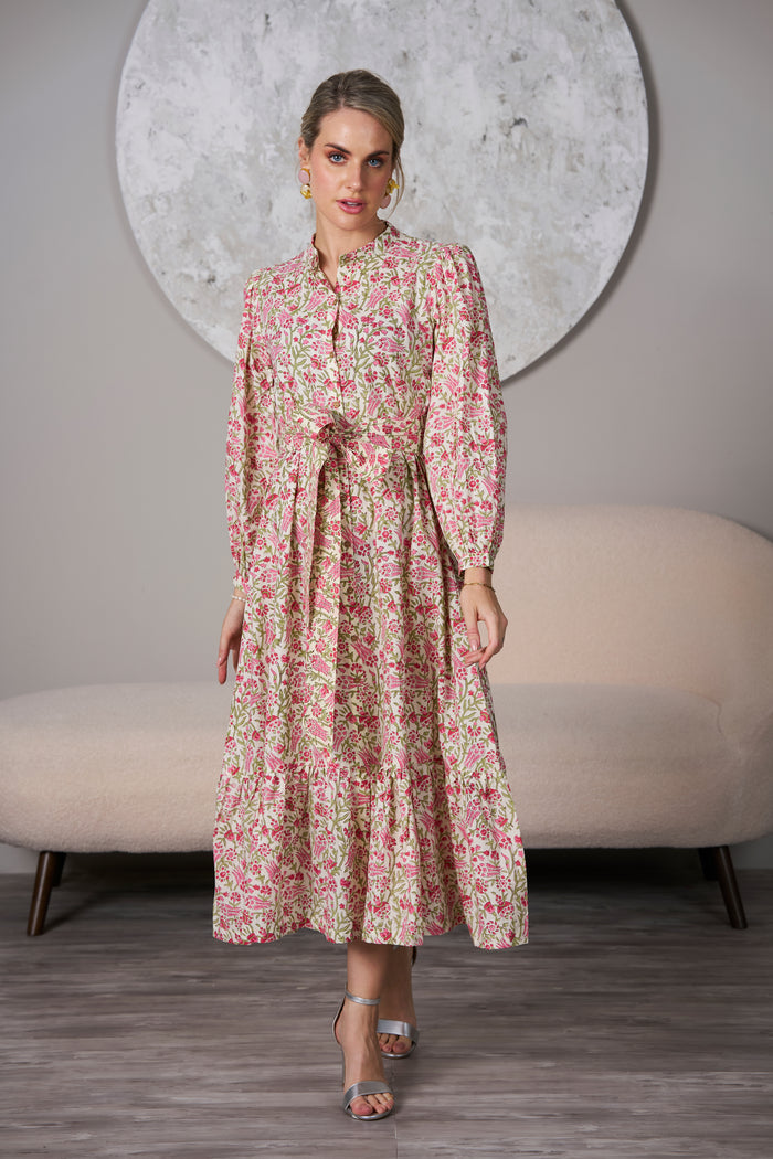 Our Pink Abbey Garden Dress is designed with this very spirit in mind. Its subtle pink hue and delicate floral design, inspired by the beauty of Abbey Gardens, bring the freshness of summer into your wardrobe. The waist-accentuating belt ensures structure while maintaining an easy, breezy vibe. It’s the kind of pink floral dress that feels just as right while toasting in the garden as it does while capturing those golden-hour moments.