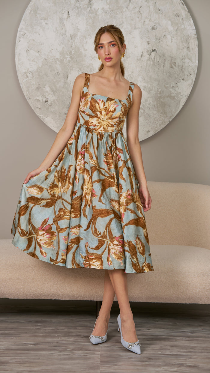 The Trevi Midi Dress is a dreamy blend of vintage romance and modern charm. Crafted from sumptuous cotton satin in a mesmerizing teal, it blooms with dainty magnolias in soft pink and gold—florals that feel straight out of a secret garden. The swoosh-worthy full circle skirt was made for movement, while the thoughtfully designed neckline keeps things flirty yet elegant. Twirl-worthy and timeless, this dress is your shortcut to chic nostalgia—wrapped in florals and finished with a dash of playful sophistication.